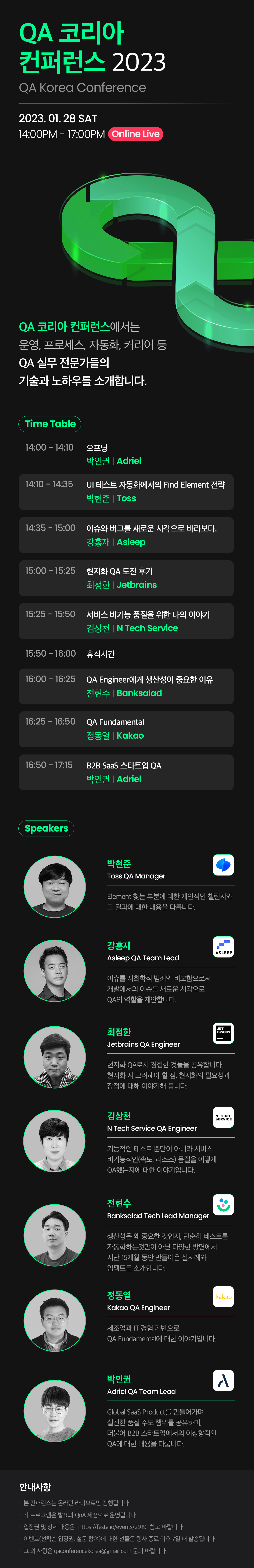 - ๊ทธ ์ธ ์ฌํญ์ qaconferencekorea@gmail.com ๋ฌธ์ ๋ฐ๋๋๋ค.