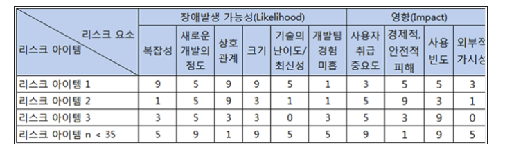 - ๋ฆฌ์คํฌ ๋งคํธ๋ฆญ์ค(Risk Matrix) ๋ฅผ ์์ฑํ์ฌ ๋ฆฌ์คํฌ ์์ดํ ๋ณ ์์๋ฅผ ํ์ํฉ๋๋ค.